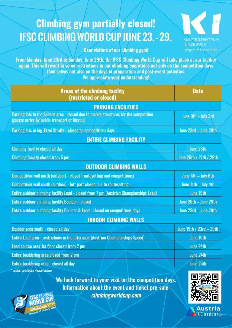 IFSC World Cup 2025 Restrictions: Climbing gym and parking spaces partially closed
