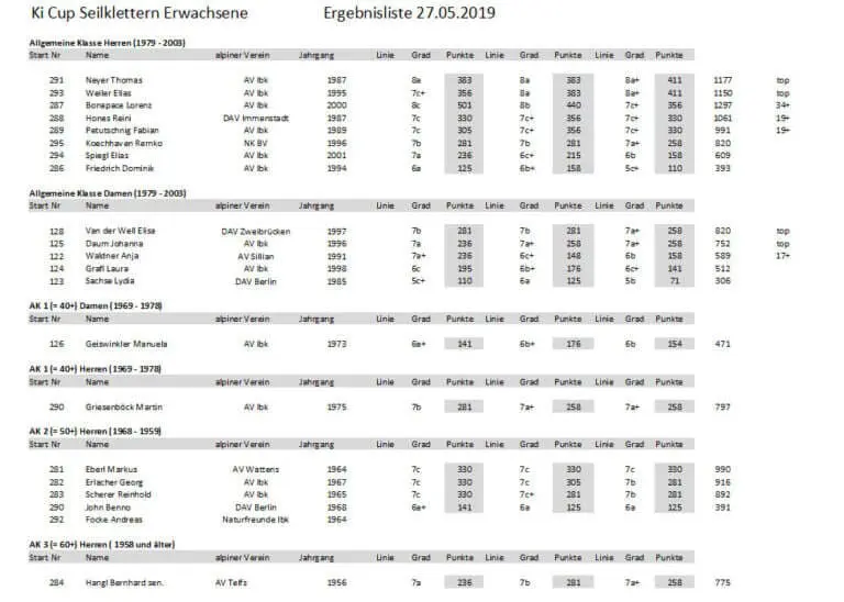 ERWACHSENE: Jeder hat die Möglichkeit, innerhalb von 2 Stunden 3 verschiedene selbst ausgesuchte Routen (after work, flash oder onsight) zu klettern. Es dürfen in dieser Zeit nur diese 3 Routen geklettert werden. Pro Route nur 1 Versuch. Jeder Schwierigkeitsgrad der ausgewählten Route hat eine bestimmte Punkteanzahl, die man erreicht, wenn man die Route ohne Fehler bis zum Top klettern kann. Pro Anzahl an Schlingen, in die man unterhalb vom Top stürzt, wird auch aus der Tabelle die Punktezahl aus ebenso vielen Zeilen darunter gewertet. Es muss selbst und ehrlich nach jedem Versuch in der Tabelle auf der Flipchart eingetragen werden. Die nächste Route darf erst gestartet werden, wenn die vorherige in der Tabelle eingetragen wurde. Ein Schiedsrichter macht Stichprobenkontrollen. Wer falsch einträgt oder schwindelt, wird vom Bewerb ausgeschlossen!