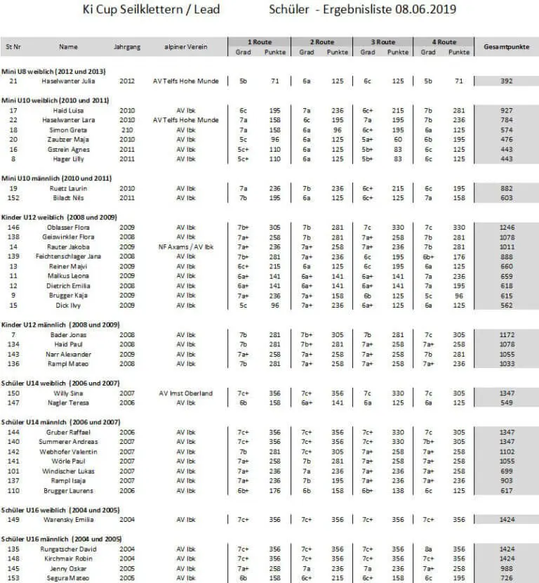 Vereinsmeisterschaften des Innsbrucker Alpenvereins. Es gibt 2 offene Cupbewerbe, an denen auch Mitglieder anderer alpiner Vereine teilnehmen können und eine finale Vereinsmeisterschaft, an der nur noch Mitglieder und Gastmitglieder des Innsbrucker Alpenvereins teilnehmen dürfen. Bei der finalen Vereinsmeisterschaft wird sowohl der Tagessieger, als auch der Cup Sieger (bestehend aus 3 Bewerben) ermittelt. Änderungen vorbehalten! Ohne Vereinsausweis keine Teilnahme möglich!