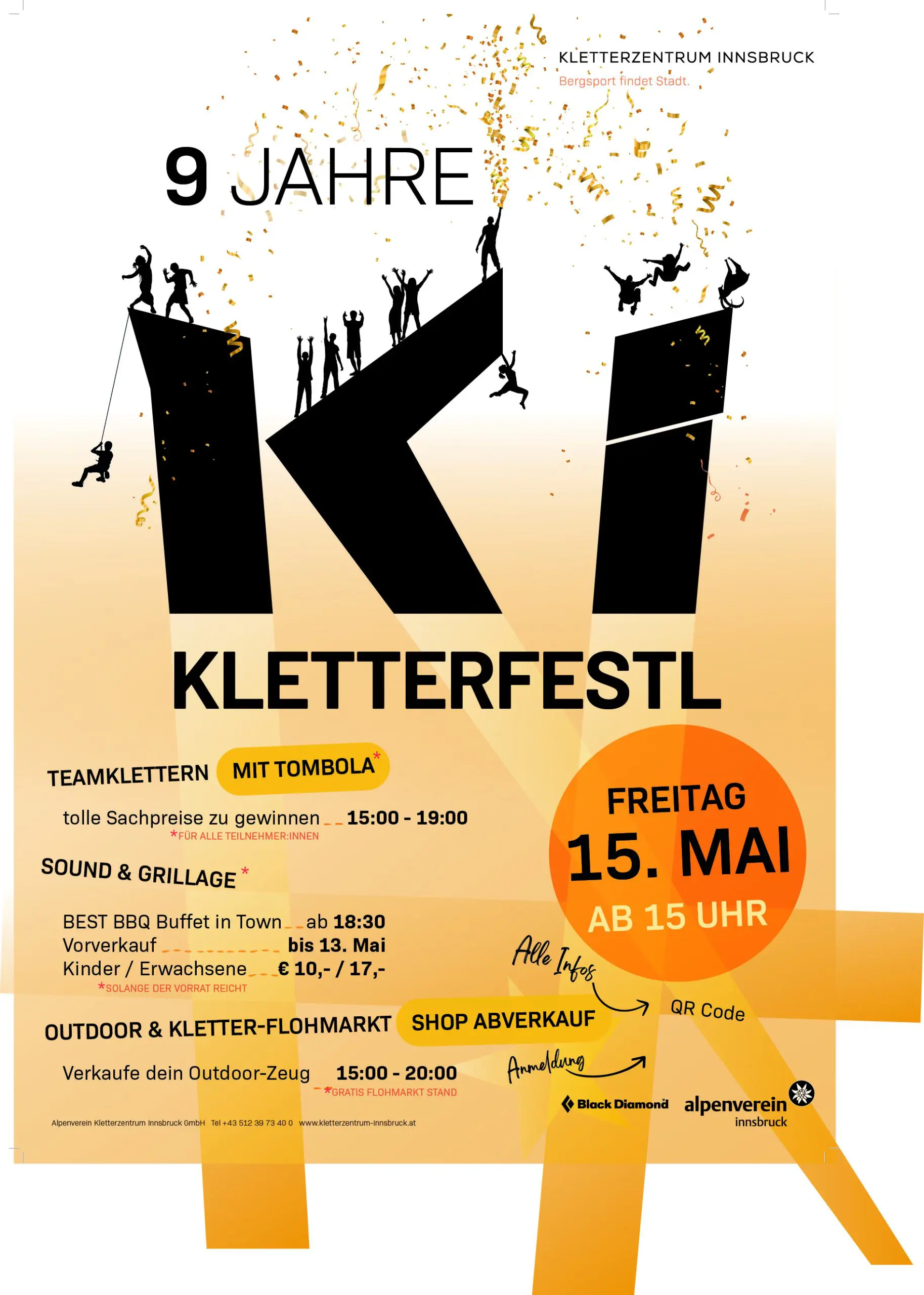Geburtstagsfeier – 9 Jahre Kletterzentrum Innsbruck mit Kletterfestl, Grillage, Sound und Flohmarkt am Freitag, den 15. Mai 2026