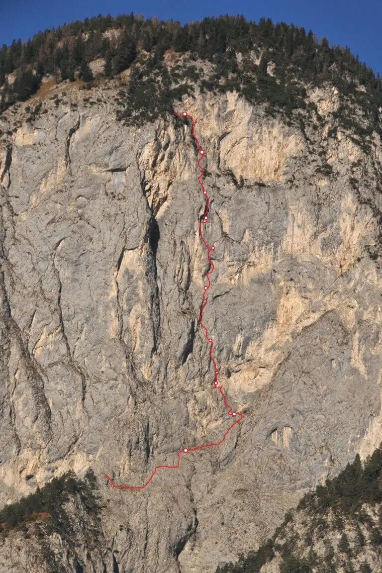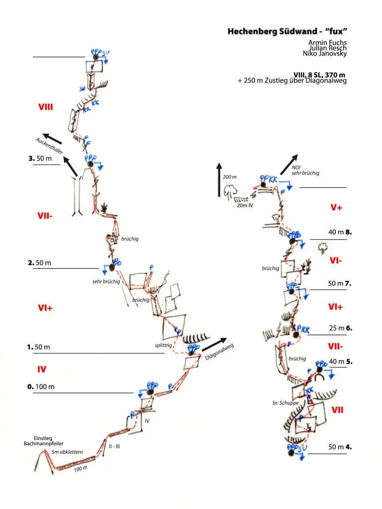 Im Jahr 2021 eröffnen Fuchs / Resch / Janovsky eine neue Kletterei am Hechenberg, die durchgehend anspruchsvoll ist und viel alpine Erfahrung erfordert. Das Anbringen von mobilen Sicherungen ist oft schwierig und über so manche Strecke auch nicht möglich. Abgesehen von den Ständen steckt nur wenig fixes Material. Hinzu kommt die notorische Neigung des Hechenbergs zu grundsätzlicher Brüchigkeit, garniert mit stellenweise heillosem Schotter. Die Erwähnung der obligatorischen senkrechten Grasschrofen sollte dem Hechenbergaspiranten keine Schweißperlen auf die Stirn treiben, sondern ihn ermutigen hin und wieder ein Graspölsterchen mit geeignetem Hammer zu entfernen, um das eine oder andere Hakenplacement zu finden.