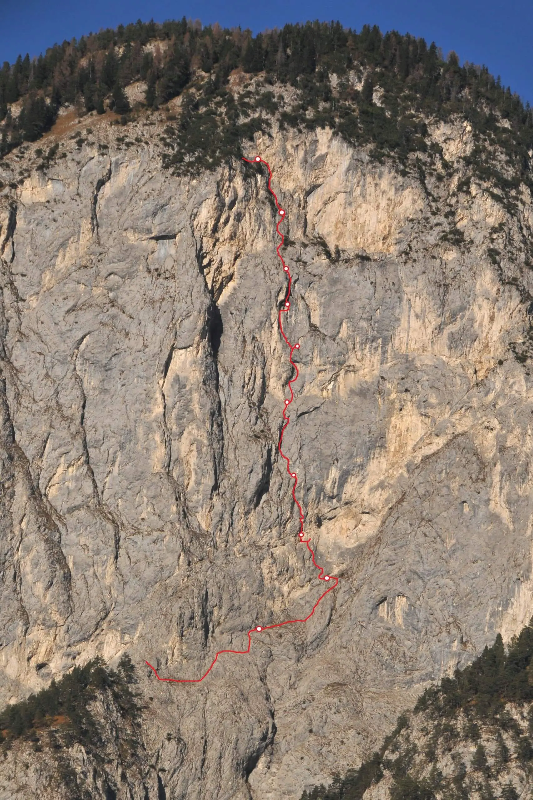 Abgesehen davon, erwarten die Wiederholer aber auch tolle, gut zu kletternde Felsmeter, ein einmaliges alpin-urbanes Ambiente und eine grandiose Reise durch die natürlichen Schwachstellen des Wandteils rechts der bestehenden Linien.