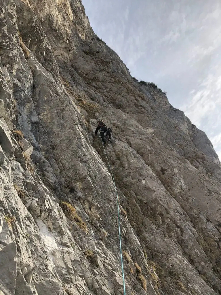 Runout; über größere Strecken wenig Sicherungsmöglichkeiten, teilw. brüchig. Stand von L6 gut kontrollieren (brüchiger Bereich)!