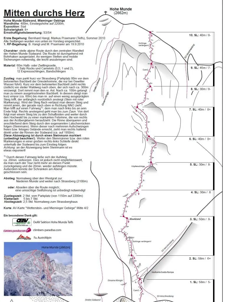 Zustieg: man parkt kurz vor Strassberg (Parkplatz 80m vor dem betonierten Bachbett der Grieslehnrinne, die nur bei Gewitter Wasser führt). Kurz vor dem betonierten Bachbett zieht rechts (östlich) ein steiler Waldweg nach oben, der sich nach ca. 300m verzweigt. Dort nimmt man den re. Ast. Nach ca. 100m gelangt man zu einem ausgetrockneten Bachbett. In diesem steigt man kurz empor (ca. 60m) bis man re. auf einen wenig ausgeprägten Steig trifft, der anfänglich nordöstlich ansteigt (Stein mit roter Markierung). Wird der Steig flach verlässt man diesen Steig und nimmt jenen, der gerade nach oben in Richtung NNO zieht. Man trifft auf einen Fahrweg 1) , dem man nach links bis an sein Ende folgt. Rechts ansteigend geht man bis zum Zaun. Von dort folgt man einem Steig bis zu den Schafböden und weiter durch den Hochwald bis zu einer markanten Felsrinne, die von rechts aus der Arztbergklamm heraufzieht. Die Rinne überqueren und anschließend dem Steig durch den sogenannten Latschenrücken folgen (Steinmann). Wenn dieser nach mehreren Aufschwüngen freies bzw. felsiges Gelände erreicht, zieht man rechts haltend direkt unter die Rinnen der Südwand (ca. auf 1950m). Diese Abzweigung ist durch einen Steinmann markiert (unbedingt beachten!). Weiter den Steinmänner bzw. den roten Markierungen in einer großen rechts-links Schleife direkt unterhalb der Südwand bis zum Einstieg folgen. Achtung: an der Abzweigung beim Steinmann ist es etwas exponiert!) Durch diesen Fahrweg ließe sich der Aufstieg ca. 20min. verkürzen. Dies ist jedoch nicht empfehlenswert, da man nach der Tour nicht mehr an diesen Punkt zurückgelang und die 20min. wieder aufsteigen müsste. Außerdem könnte der Schranken am Abend geschlossen sein. Abstieg Normalweg über den Westgrat zur Niederen Munde 2100m und weiter nach Strassberg (1200m) Abseilen über die Route ist möglich, aber nicht empfehlenswert, eine umsichtige Seilführung ist unabdingbar. Karte: AV-Karte „Wetterstein- und Mieminger Gebirge“ Mitte.