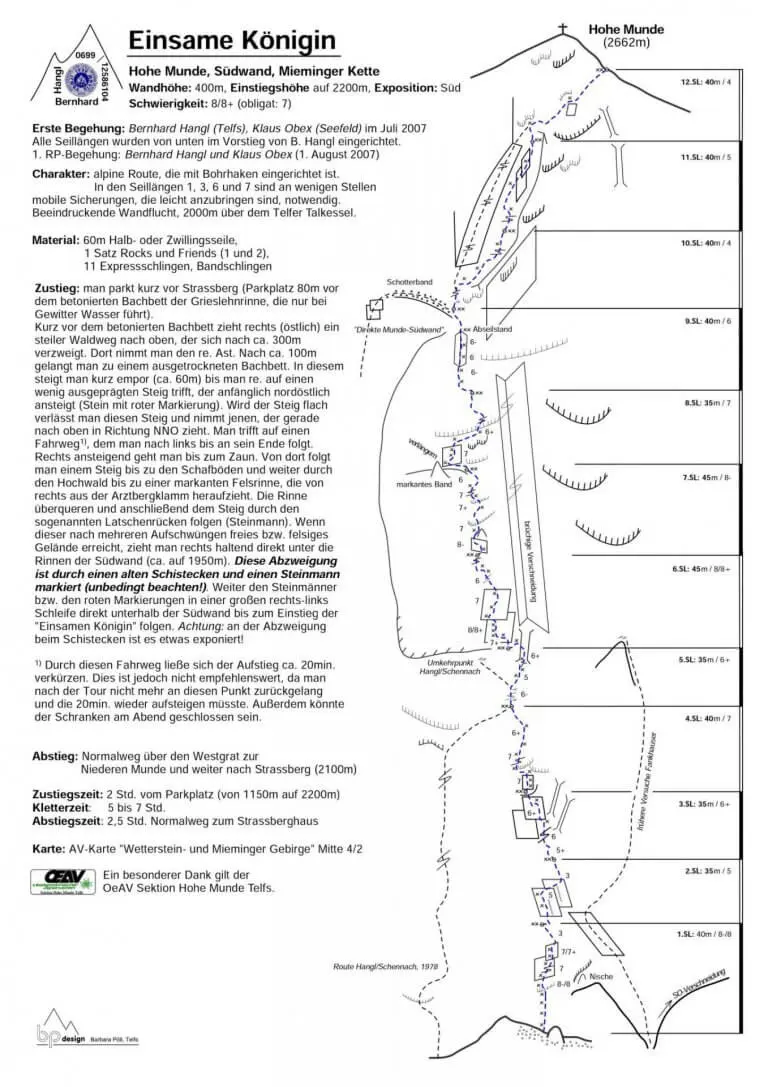 7.10.2007 Bereits im Sommer konnte Hangl Benny sen. eine Neutour durch die Hohe Munde Südwand eröffnen. Die einsame Königin 8/8+, 400m, 12 Sl, mit Bohrhaken gesichert und dennoch alpin, stellt hoffentlich einen Neubeginn in der Hohen Munde Kletterei dar. Gerade die hohe Munde, mit ihren drei klassischen Linien, einst so beliebt war und in letzter Zeit auf Grund des alpinen Charakters und des langen Zustieges in Vergessenheit geraten ist. Gratulation an Hangl Benny.