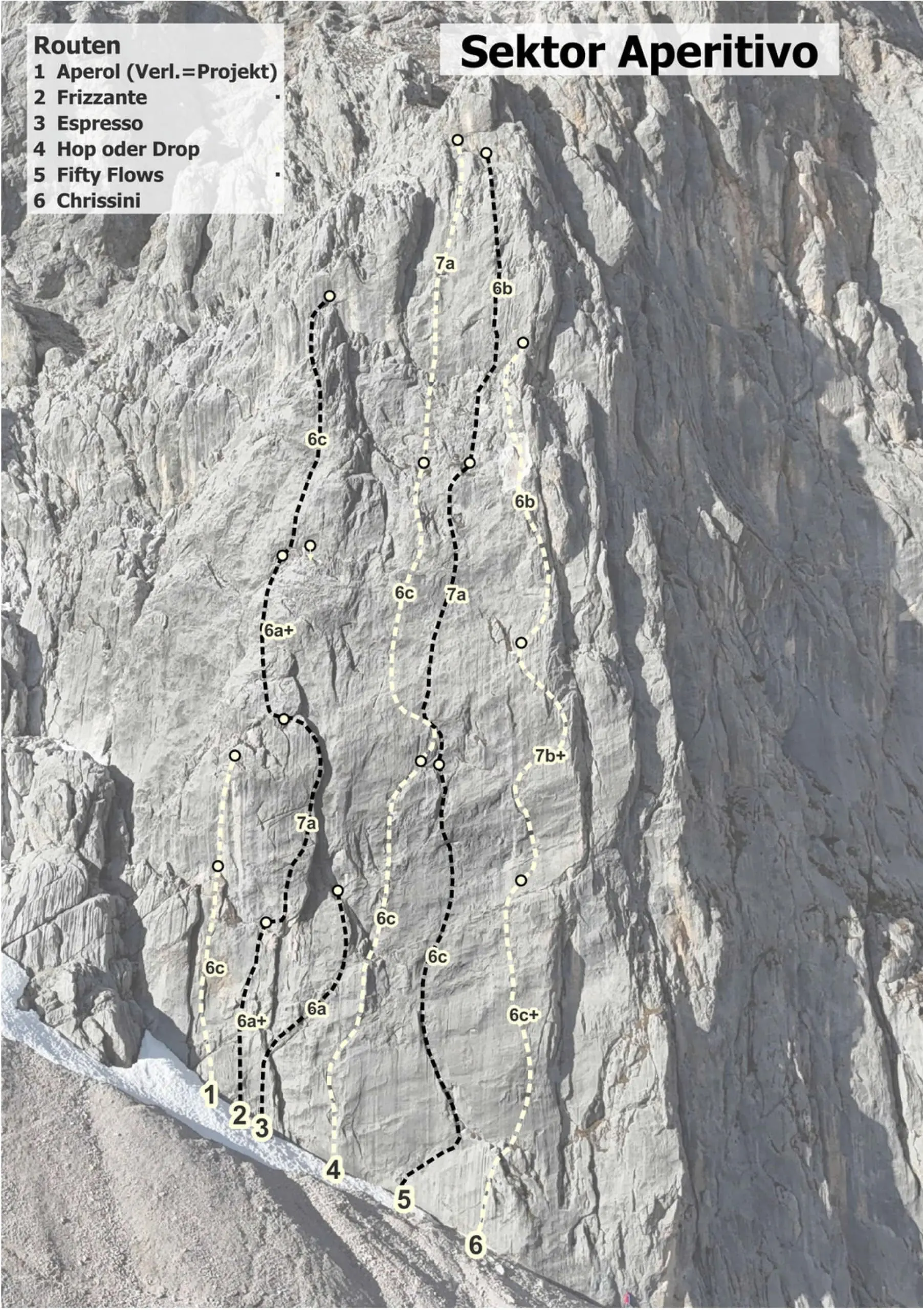 Von den Neutouren an der Scharnitzspitze inspiriert, wurde auch ein neuer Sektor an der Südwand des Oberreintalschrofens eingerichtet. Steile Wand- und Plattenkletterei in allerbestem Wettersteinkalk, gut mit Bohrhaken abgesichert und Kettenstände zum Abseilen sind Zutaten, welche diese Routen sicher bald beliebt machen werden und (wie den Figaro-Sektor) bei unsicherem Wetter oder schlechten Bedingungen in den langen Routen, auch lohnende Ausweichziele darstellen. Die Liste der Erschließer liest sich wie das Who-is-Who der Innsbrucker Kletterszene: Fritz Huber, Thomas Schöpf, Florian Leitgeb, Luis Knabl und natürlich auch Christian Tollinger, der uns dankenswerterweise auch die Routeninfos zur Verfügung stellte.