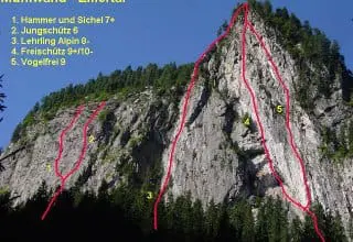 Update: die Tour ist nicht merh im Topo enthalten, weil man viele andere Touren quert und es bessere Roten an dieser Wand gibt (siehe oben)