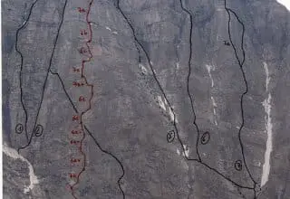 5 kurze Seillängen, immer wieder durch Bänder unterbrochen. Mit 3 mal A0 in der 4. Seillänge (frei 8+) hat man eine schöne 7er Tour.