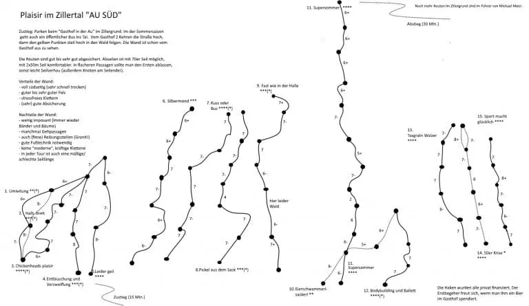 Inzwischen gibt es in „Au Süd“ 15 lange Routen. Meist handelt es sich um Touren überwiegend im 6.ten Grad mit Passagen im 7. Grad (UIAA). Wenige Klettereien haben Stellen im 8. Grad. Die kürzesten Touren sind 3 Seillängen lang, oft sind sie 4 bis 6 Seillängen, einmal sogar 11 Seillängen. Die Wand ist voll südseitig ausgerichtet, was bei den häufigen Gewittern am Alpenhauptkamm ein entscheidender Vorteil ist. Regnet es am Abend stark, ist die Wand am nächsten Tag nach 1-2 Stunden Sonne flott wieder trocken. Auch früh im Jahr (Ostern) kann man dort mit etwas Glück klettern. Ein weiterer Riesenvorteil: Mit 15 Minuten Zustieg ist die Wand selbst „Dschungelbuch-Beinchen“ zuzumuten. Beim Gestein handelt es sich um Granit/Gneis: Speckige Griffe wird es hier wohl nie geben, die Reibung ist fantastisch, allerdings sind manchmal auch die Füße mit exaktem Stehen gefragt. Die Kletterei insgesamt ist fast nie steil, eher senkrecht oder leicht geneigt. Manchmal fordern flachere Passagen eine gute Fußtechnik, jedoch nur wenige Stellen sind wirklich fiese Plattenkletterei. Jetzt aber, ehrlicherweise auch genannt: Es ist keine imposante Wand (in einer imposanten Granitwand gibt’s aber auch keine Touren im 6. oder 7. Grad). Immer wieder durchziehen Bänder die Wand. Das ist einerseits angenehm, weil man am Stand manchmal bequem im Schatten eines Baumes stehen kann, andererseits muss man manchmal wenige Meter über Schrofen oder zwischen Bäumen hochsteigen (einmal sogar 15 m). Die Absicherung erhält 4 von 5 Sternen (vergleichbar der Alpawand in BGL oder dem Urlkopf in Lofer), also stets (sehr) fair, aber klettern muss man schon noch. Wer eine Chance hat, die Route onsight zu klettern, wird nicht zittern müssen.